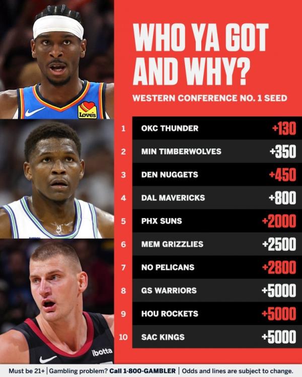 ESPN晒新赛季西部榜首赔率:雷霆+130第一 森林狼&掘金居其后 发布时间: 2024年09月11日 10:09 来源:网络 8月18日讯 今天,ESPN晒出了新赛季西部榜首球队的赔率,具体如下:1、雷霆,+130(押100,命中则连本带利得230,下同)2、森林狼,+3503、掘金,+4504、独行侠,+8005、太阳,+20006、灰熊,+25007、鹈鹕,+28008、勇士/火箭/国王,+5000 标签: 篮球 比赛集锦 WNBA NBA 篮球 西部 雷霆 森林狼 掘金 独行侠 太阳 灰熊 鹈鹕 勇士 火箭 国王